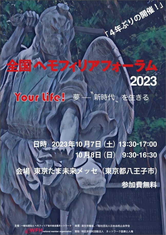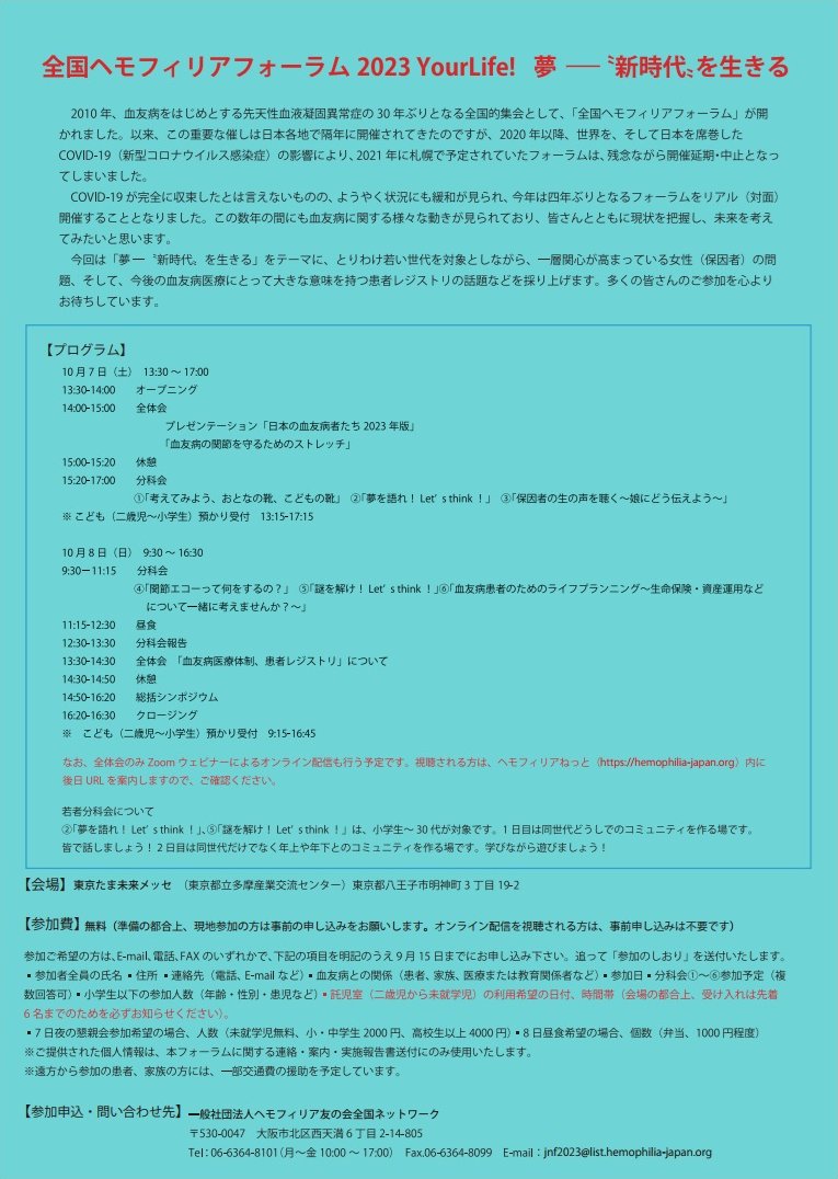 全国ヘモフィリアフォーラム2023を10月に東京・八王子市で開催いたします。