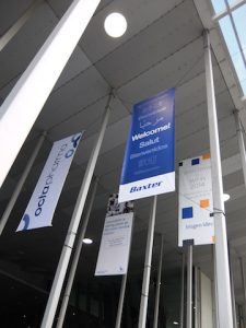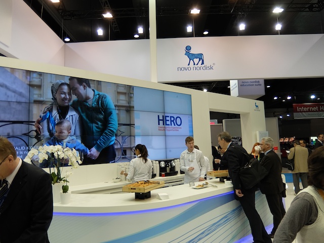 世界大会でも最も華やかなのが展示会場です。企業やWFH、各国の患者会などのブースがずらりと並びます。企業のブースではそれぞれのイメージ展示、製品の紹介、セミナーなどが行われ、軽食や飲み物が振る舞われます。中でもノボノルディスクはノボエイト発売もあってか、かなりのスペースを占めていました。ノボは会場の入口すぐの橋やトラム(路面電車)の停留所にも広告を出していて、その量は群を抜いていました。