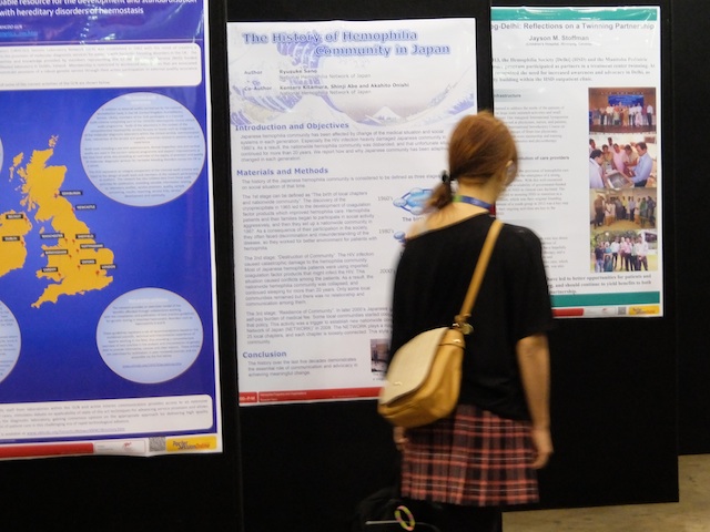 会場でそれぞれの発表を見ながら感じたのは、「私たちの発表内容はかなり珍しい」ということです。患者会の特定活動の実績報告などは実にたくさんあるのですが、患者会の歴史なんて内容は私たちだけです。エントリーするときも、どの領域に出したらよいか非常に迷って、結局”Hemophilia Programs and Organization”というのがいちばん近そうだったので、この領域で提出しています。私たちの感覚にどこかズレがあるのではないかと、少し心配になりました。
